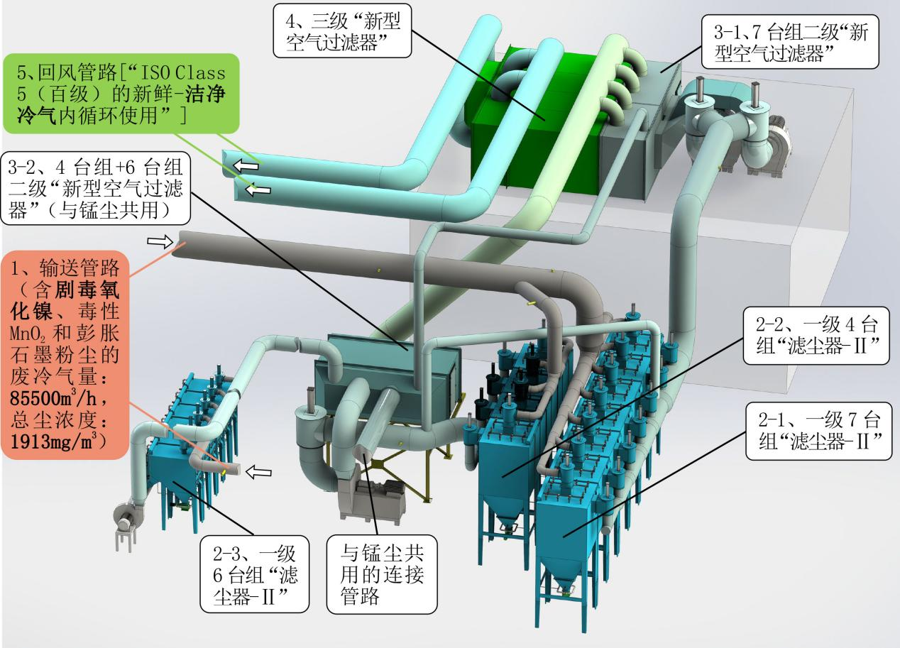 依托自主核心的顛覆性技術(shù)------“把劇毒氧化鎳+普通毒性二氧化錳+石墨粉塵污染嚴(yán)重(1913mg/m3) 的廢冷氣直接轉(zhuǎn)化為百級潔凈冷氣(≤6×10-7mg/m3, 其中,劇毒氧化鎳<10-8 mg/m3,即儀器完全檢測不到氧化鎳粉塵的存在)---100%送回車間內(nèi)循環(huán)使用”, 同步實(shí)現(xiàn):變“雙瓶頸”為“雙零”、直接成為“百級潔凈車間”、冷氣100%回收、 貴重粉塵回收率≥99.999%的四重目的。